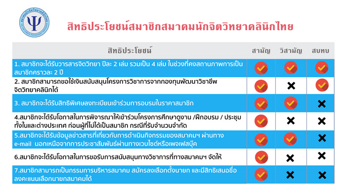5. ได้รับเอกสาร หนังสือของสมาคมฯ และประดับเครื่องหมายของสมาคมนักจิตวิทยาคลินิกไทยในโอกาสอันสมควรตลอดอายุการเป็นสมาชิก