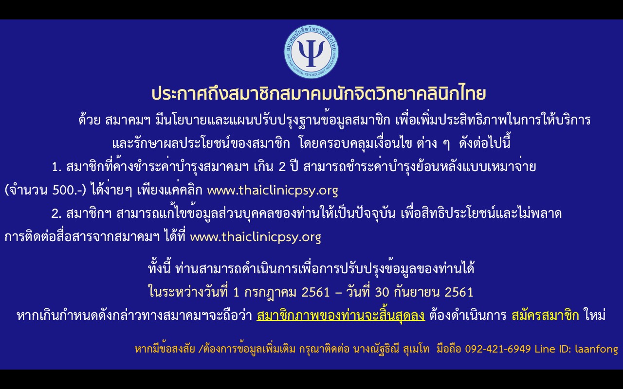 ข่าวประกาศที่สำคัญ รายละเอียด เขียนโดย Super User ฮิต: 6195 ประกาศถึงสมาชิกสมาคมนักจิตวิทยาคลินิกไทย เรื่อง การชำระค่าบำรุงสมาคมฯ และการแก้ไขข้อมูลประวัติสมาชิกด้วยตนเอง ชำระค่าบำรุงสมาชิก แก้ไขประวัติสมาชิก ก่อนหน้า ต่อไป
