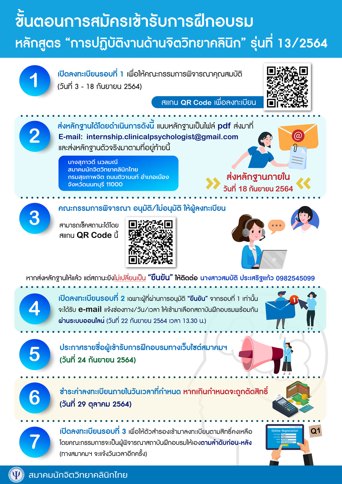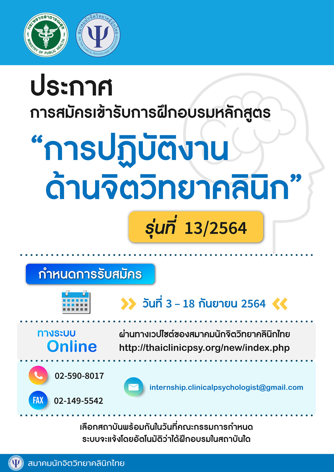 ประกาศการสมัครเข้ารับการฝึกอบรมหลักสูตร “การปฏิบัติงานด้านจิตวิทยาคลินิก” รุ่นที่ 13/2564