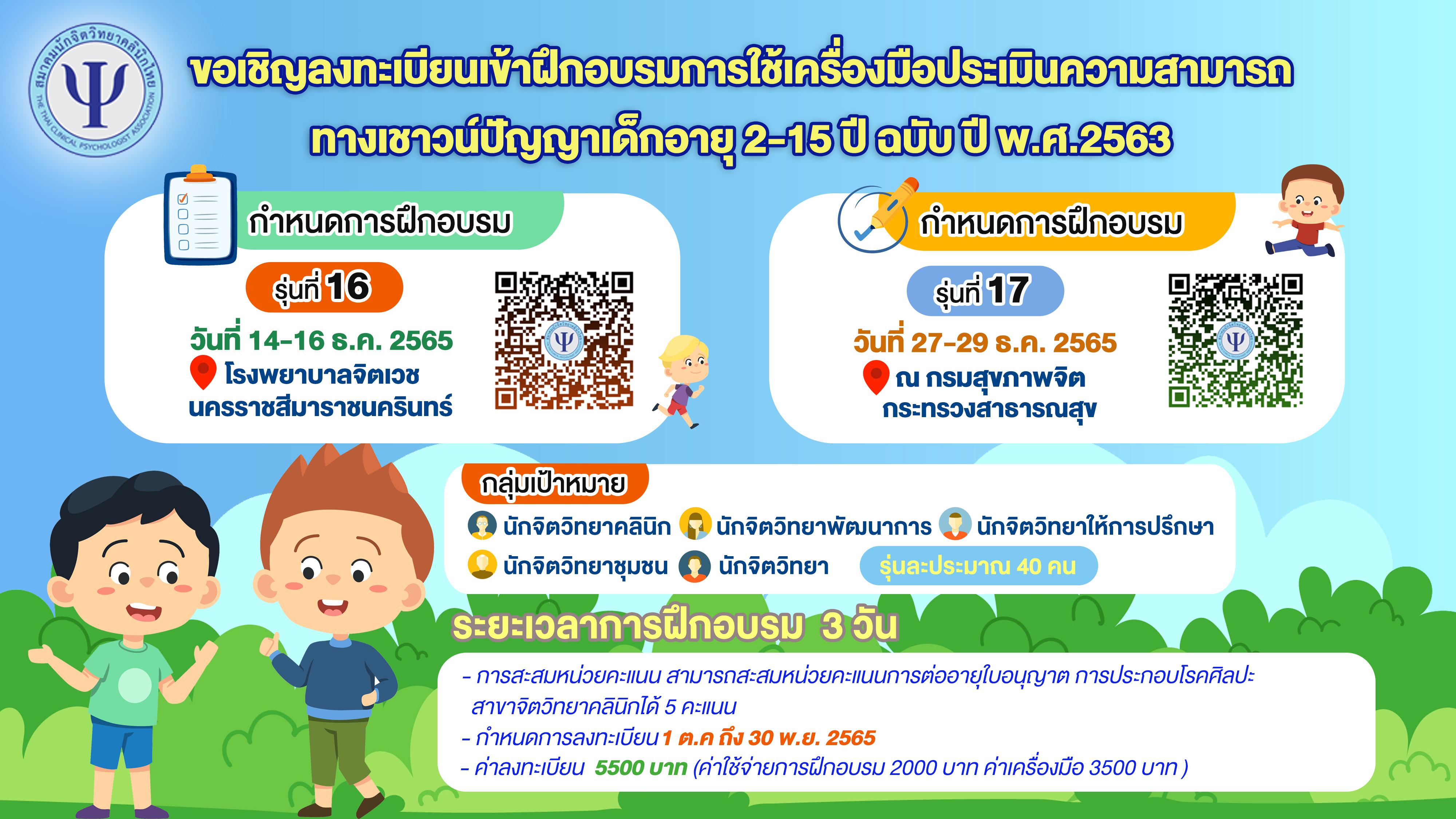 ลงทะเบียนเข้าฝึกอบรมการใช้เครื่องมือประเมินความสามารถทางเชาวน์ปัญญาเด็กอายุ 2-15 ปี ฉบับ ปี พ.ศ.2563 รุ่นที่ 16 และรุ่นที่ 17