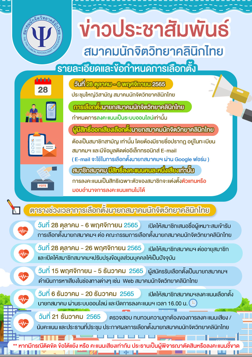 เรื่อง : รายละเอียด ข้อกำหนดและขั้นตอน การเลือกตั้งนายกสมาคมนักจิตวิทยาคลินิกไทย