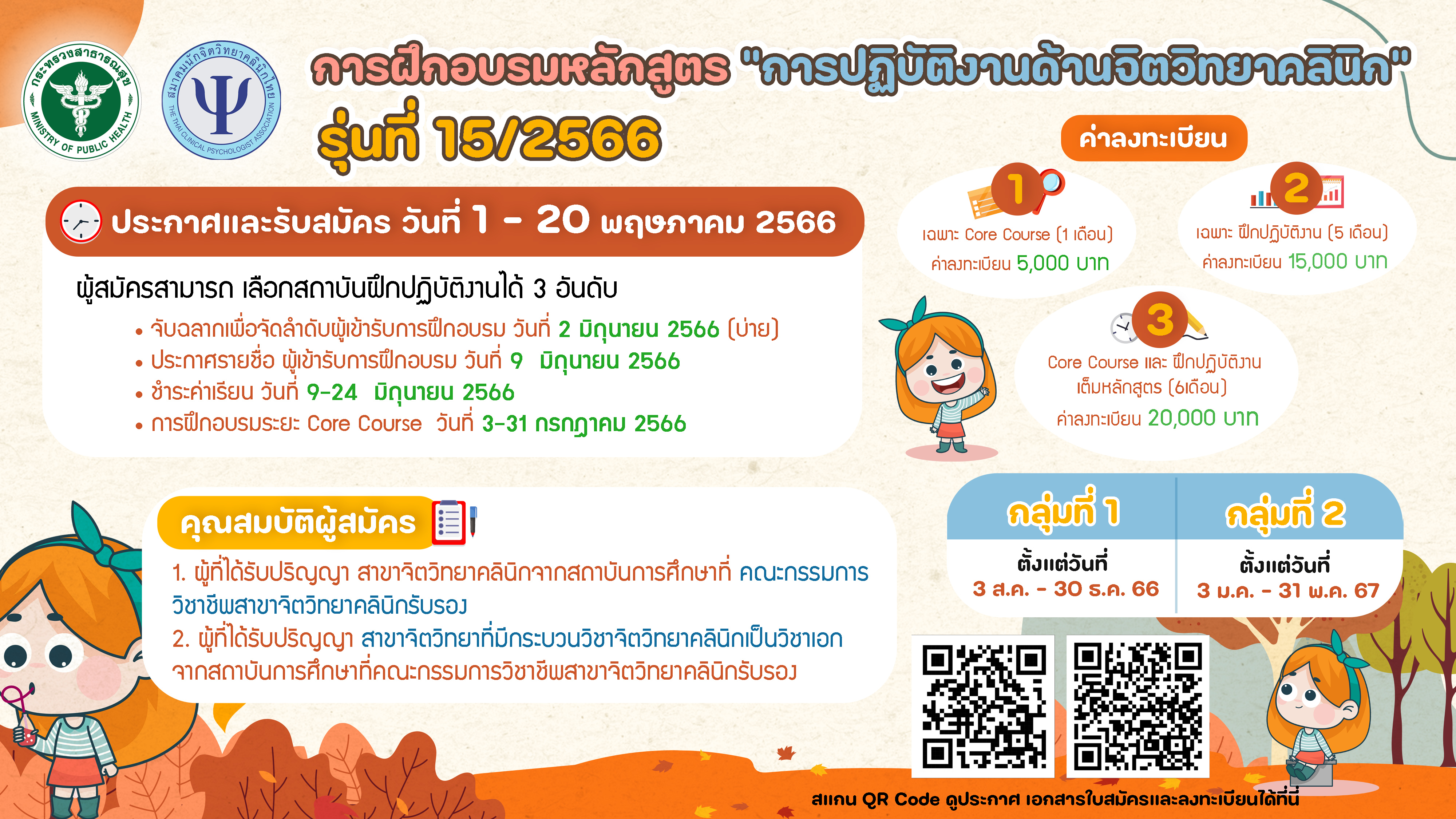 ข่าวประกาศที่สำคัญ ขอประชาสัมพันธ์ การฝึกอบรมหลักสูตร “การปฏิบัติงานด้านจิตวิทยาคลินิก” รุ่นที่ 15/2566 ลงทะเบียน คลิกที่นี่ Attachments: หนังสือเชิญอบรม โครงการฝึกอบรมหลักสูตรการฝึกปฏิบัติงานด้านจิตวิทยาคลินิก [หนังสือเชิญอบรม โครงการฝึกอบรมหลักสูตรการฝึกปฏิบัติงานด้านจิตวิทยาคลินิก ]100 kB ประกาศการสมัครเข้ารับการฝึกอบรมหลักสูตร[ประกาศการสมัครเข้ารับการฝึกอบรมหลักสูตร]325 kB ใบสมัครเข้ารับการอบรมหลักสูตรการฝึกอบรม[ใบสมัครเข้ารับการอบรมหลักสูตรการฝึกอบรม]18 kB โครงการฝึกอบรมหลักสูตร “การปฎิบัติงานด้านจิตวิทยาคลินิก”[โครงการฝึกอบรมหลักสูตร “การปฎิบัติงานด้านจิตวิทยาคลินิก”]88 kB