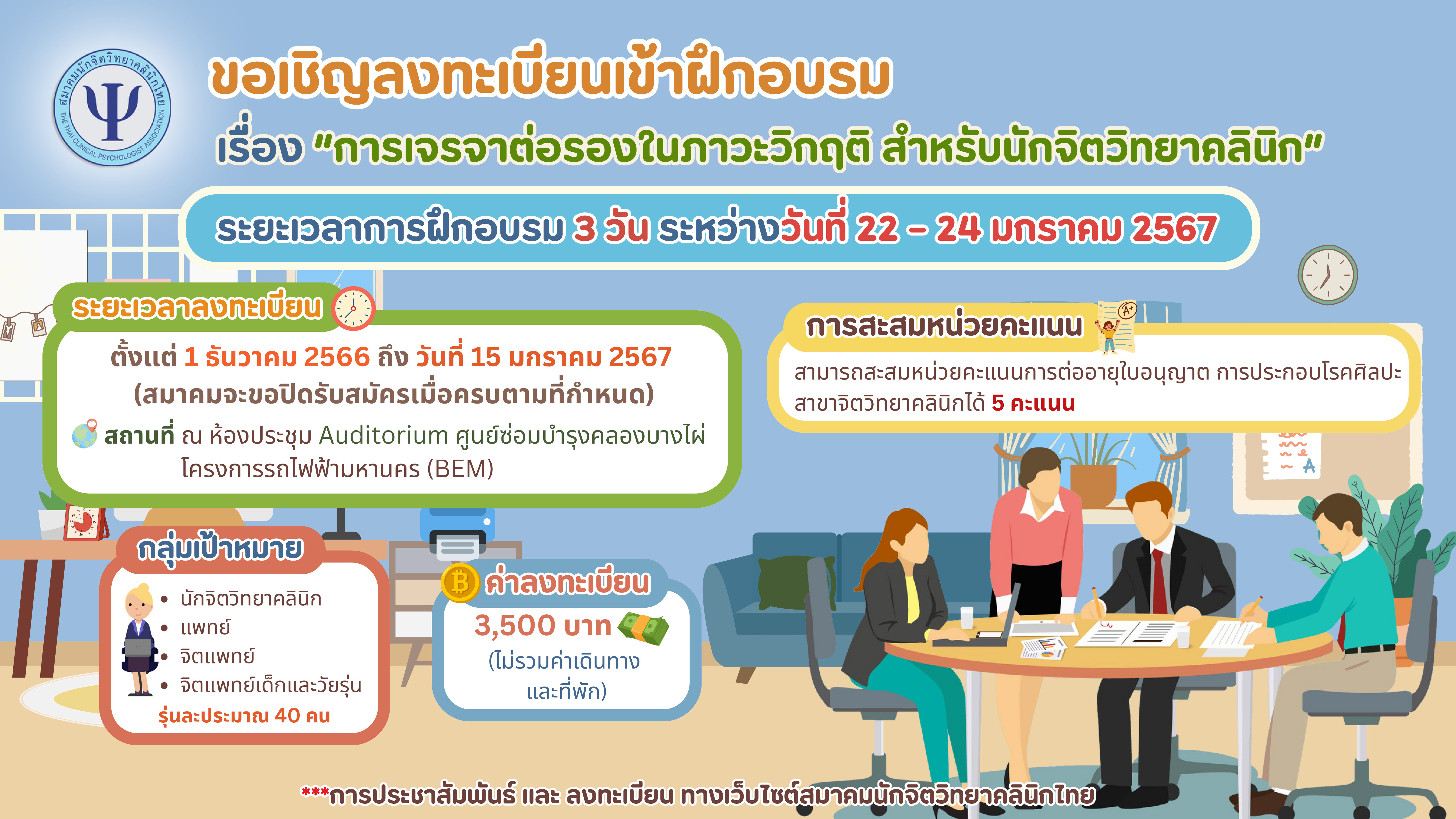 ข่าวประกาศที่สำคัญ ลงทะเบียน คลิกที่นี่ Attachments: โครงการฝึกอบรมเรื่อง “การเจรจาต่อรองในภาวะวิกฤติ สำหรับนักจิตวิทยาคลินิก”[โครงการฝึกอบรมเรื่อง “การเจรจาต่อรองในภาวะวิกฤติ สำหรับนักจิตวิทยาคลินิก”]88 kB โครงการฝึกอบรมเรื่อง “การเจรจาต่อรองในภาวะวิกฤติ สำหรับนักจิตวิทยาคลินิก”[โครงการฝึกอบรมเรื่อง “การเจรจาต่อรองในภาวะวิกฤติ สำหรับนักจิตวิทยาคลินิก”]148 kB