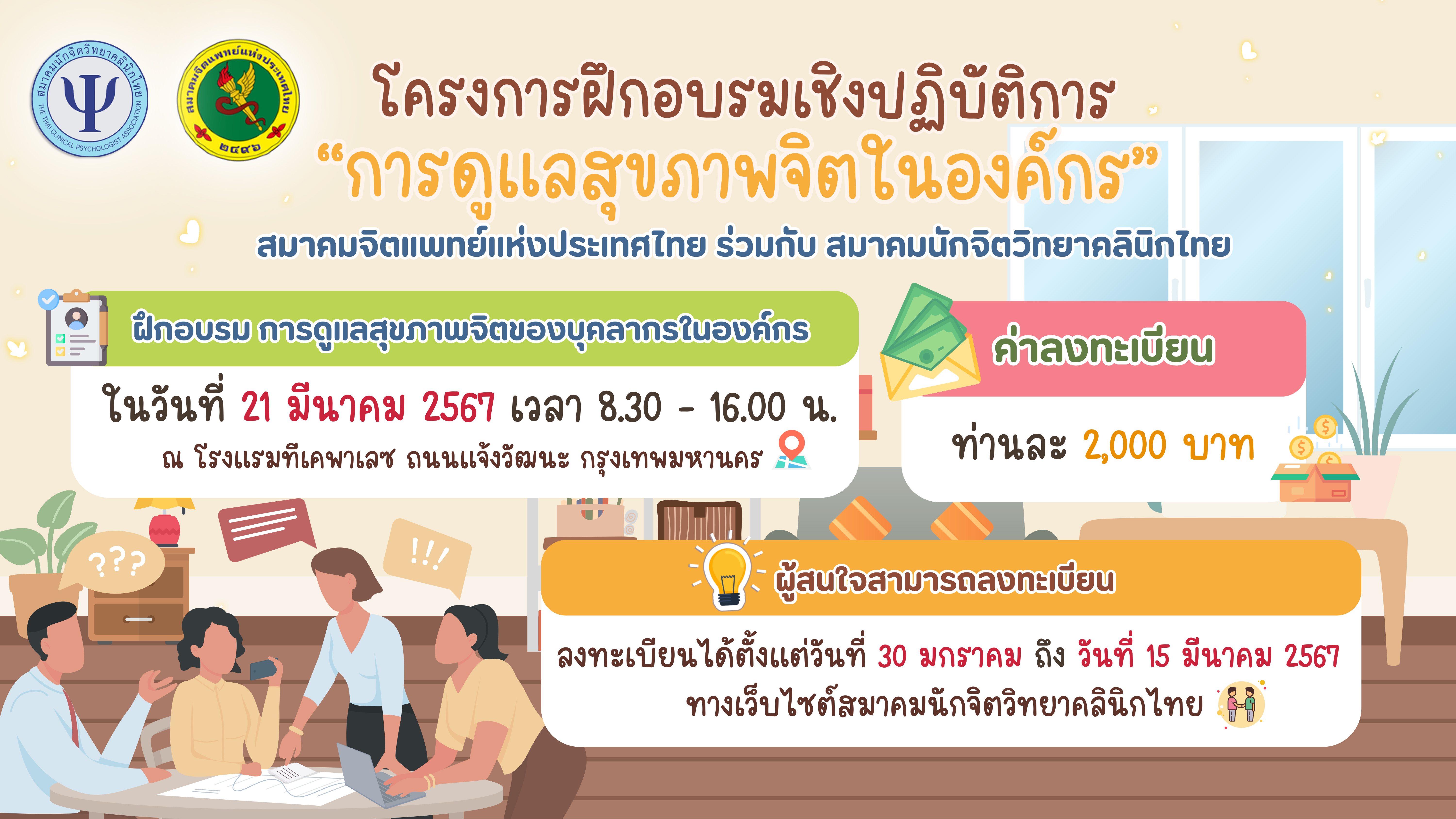 ข่าวประกาศที่สำคัญ Attachments: หนังสือ ขอเชิญเข้าร่วมการฝึกอบรม[หนังสือ ขอเชิญเข้าร่วมการฝึกอบรม]214 kB ขอเชิญเข้าร่วมการฝึกอบรมเชิงปฏิบัติการ การดูแลสุขภาพจิตในองค์กร[ ]90 kB