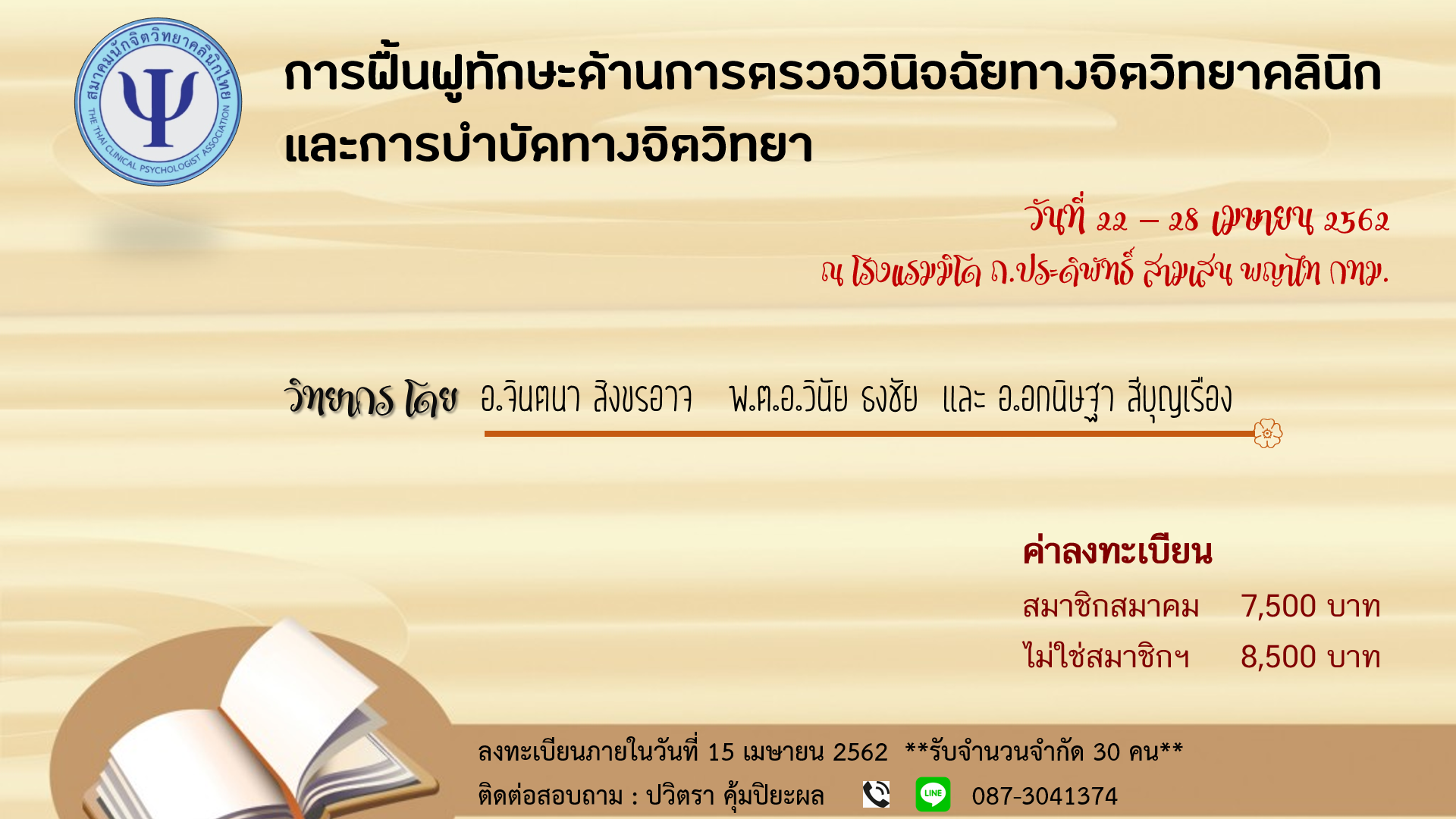 ข่าวประกาศ รายละเอียด เขียนโดย Super User ฮิต: 5689 การฟื้นฟูทักษะด้านการตรวจวินิจฉัยทางจิตวิทยาคลินิกและการบำบัดทางจิตวิทยา คลิกที่แบนเนอร์เพื่อเข้าสู่ระบบลงทะเบียน Attachments: จดหมายเชิญ[download]110 kB MIDO HOTEL[download]38 kB รายละเอียดโครงการ[download]115 kB กำหนดการประชุม[download]25 kB ก่อนหน้า ต่อไป