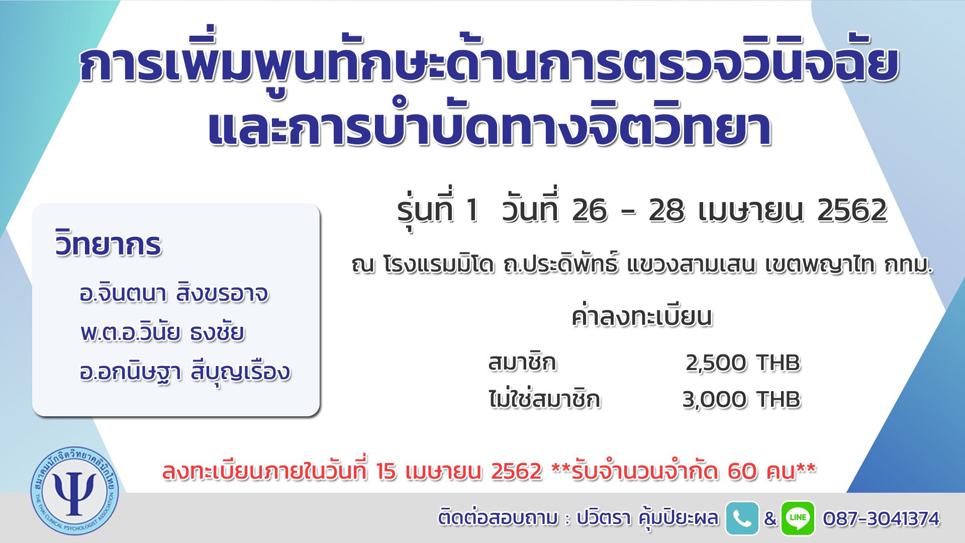 ข่าวประกาศ รายละเอียด เขียนโดย Super User ฮิต: 4804 การเพิ่มพูนทักษะด้านการตรวจวินิจฉัยทางจิตวิทยาคลินิกและการบำบัดทางจิตวิทยา รุ่นที่ 1/2562 คลิกที่แบนเนอร์เพื่อเข้าสู่ระบบลงทะเบียน Attachments: จดหมายเชิญ[download]135 kB MIDO HOTEL[download]38 kB กำหนดการประชุม[download]58 kB รายละเอียดโครงการ[download]105 kB ก่อนหน้า ต่อไป