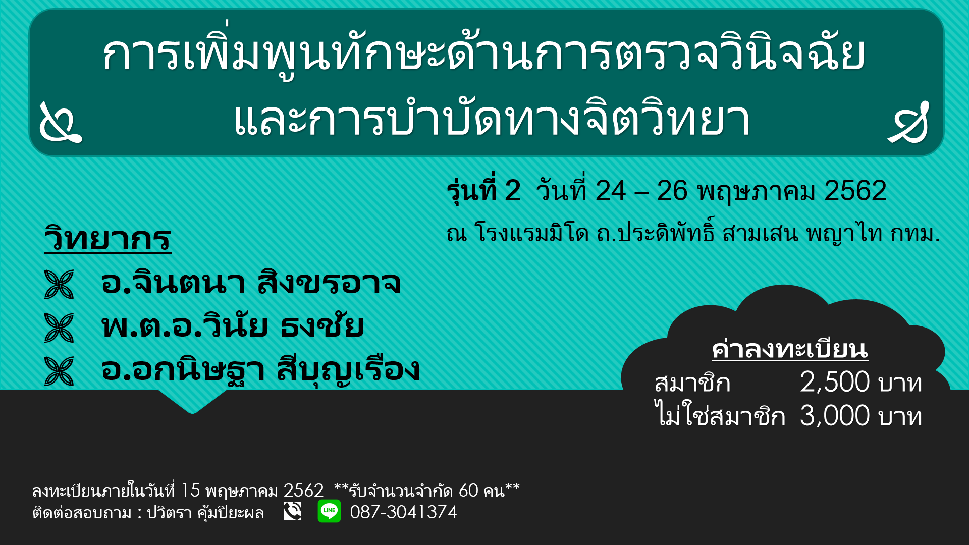 ข่าวประกาศ รายละเอียด เขียนโดย Super User ฮิต: 5066 การเพิ่มพูนทักษะด้านการตรวจวินิจฉัยทางจิตวิทยาคลินิกและการบำบัดทางจิตวิทยา รุ่นที่ 2/2562 คลิกที่แบนเนอร์เพื่อเข้าสู่ระบบลงทะเบียน Attachments: จดหมายเชิญ[download]135 kB MIDO HOTEL[download]38 kB กำหนดการประชุม[download]58 kB รายละเอียดโครงการ[download]105 kB ก่อนหน้า ต่อไป
