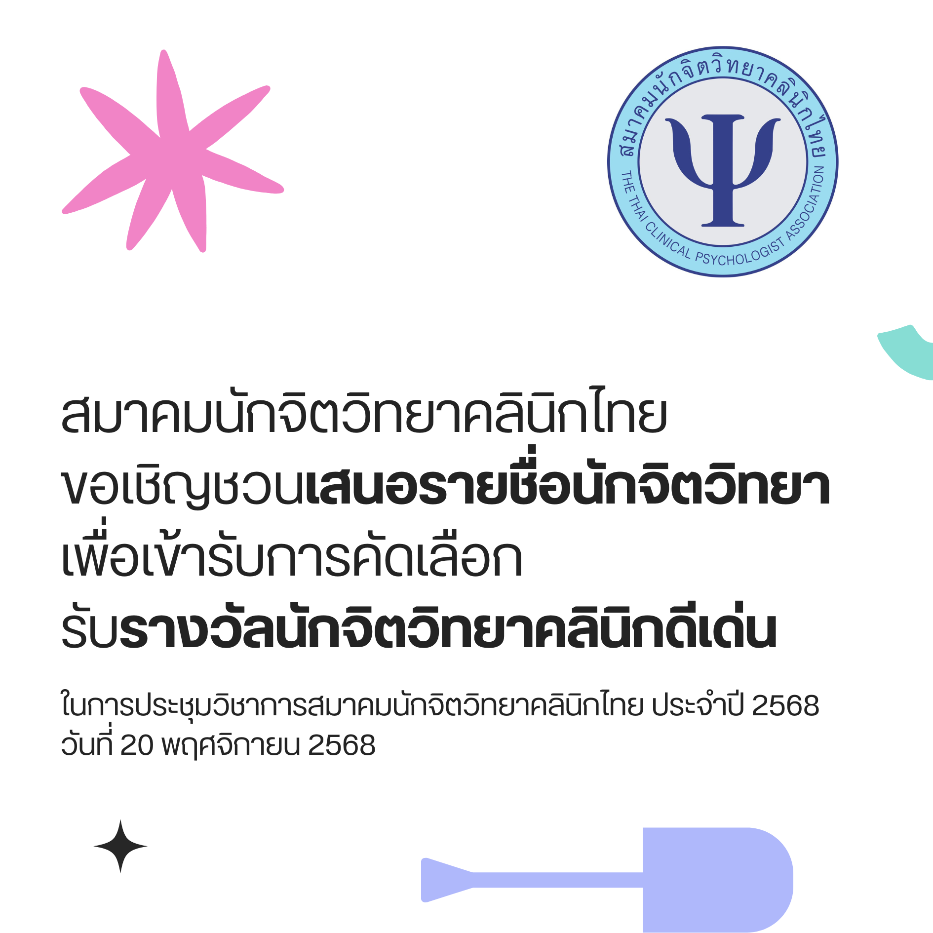 สมาคมนักจิตวิทยาคลินิกไทยขอเชิญชวนเสนอรายชื่อนักจิตวิทยาเพื่อเข้ารับการคัดเลือกรับรางวัลนักจิตวิทยาคลินิกดีเด่นประจำปี 2568